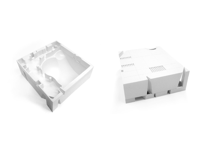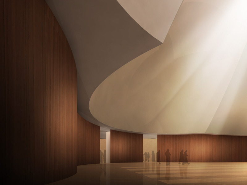 This mosque is meant to be a prototype for an inner city daily mosque in Doha. Its simple volume reflects the modesty of daily prayer. It is both welcoming towards the public and protective of the sanctity of prayer. It stands apart from the adjacent building while being integrated with the surrounding context. The volume is carved by a series of cuts that provide access at the base and bring in light from the top. These cuts also create minarets at the corners projecting toward the adjacent public spaces without protruding above the skyline of the city. The sculpted, intersecting vaults of the prayer hall create an inner space carved within the building’s volume, and with light washing in from the oculus above they evoke a feeling of peaceful contemplation.