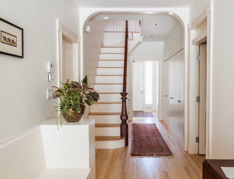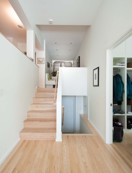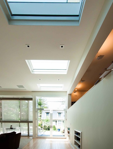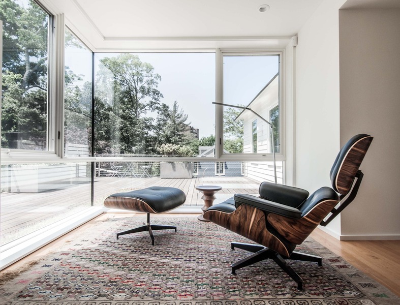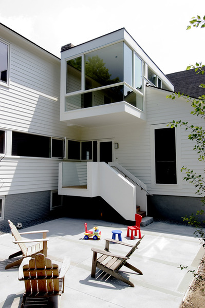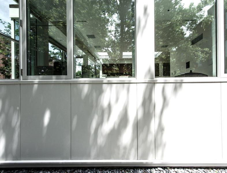 5 Dana Street is an existing single-family house located between a historic, residential area in Cambridge and the commercial strip along Massachusetts Avenue. Built in the 1830s in the Greek Revival style, the house maintains the original layout of a Doric porch, a two-story volume organized along a central hall and stair. An “ell” extension on the back includes the kitchen and den on the ground floor and an additional bedroom and services on the second. With a setback of about 75 feet from Dana Street, the house has one of the largest front lawns in Middle Cambridge. Because of the large parcel size, there were no zoning constraints with respect to additional construction. The main constraints were related to the historic character of the house and the need to maintain the front of the house and its overall volume true to its original nineteenth-century character. The project contrasted the contemporary additions with the existing house and used these additions to highlight the otherwise subtle features and details of the Greek Revival house. The contrast argument won the approval of the historic commission. On the ground floor, the kitchen and den could not be accessed without passing through the main living room. On the second floor, the bedroom in the “ell” could not be accessed without going through a front bedroom. The solution entailed a double bypass operation, one on the ground level, extending the hallway all the way to the end of the house and linking directly to the den. On the second level, a cantilevered glass box (that serves as a day-room) extends the hallway to link to the back room. The old hallway is transformed into a linear master bathroom. Despite its large outdoor areas, the house did not have good connections to the outdoors. By relocating the guest bathroom to the side, the main hallway is extended directly to the back garden, which could now be seen upon entering through the front door. A long strip window links the den/kitchen area to the garden and the glass box looks over the back patio.
