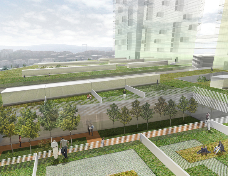 This proposal for the Zorlu Center addresses three main challenges that confront such large-scale projects, particularly in the context of Istanbul: 1. the impact on the skyline of the city particularly in such a highly visible location, 2. the isolation of such mixed use developments from the surrounding city, and 3. the isolation of the different components of the development from each other. In response, the proposed Zorlu Center introduces an integrated urban-landscape approach to the design of the mixed-use development. The Center heightens the connection to the neighboring city and landscape. It enhances the mixture among the different elements of the program and a variety of office, retail, and dwelling types catering to a variety of needs. This variety is supported by a broad palette of open spaces that create a rich urban environment. The resultant form is an axial arrangement of high rises with maximum views that give order to the skyline of Etiler and Istanbul. These high rises spring out from a land form that provides continuity with the surrounding landscape and with the city. The high rises and the base are also linked to each other through a series of cuts that create pedestrian avenues and the spaces between the towers. The dynamism of these geographic forms as their angles and arrangements change from different positions is further enhanced by a double glass façade that adds a temporal and a seasonal variety to the vitality of this urban experience. The Zorlu Center is located at the critical intersection between the first peripheral highway of Istanbul and the two main connections to the European side of the city, namely Buyukdere and Barbaros Avenues. It acts as the knot between the three parts of the city and the edge between the inner city and the new business center. The topography and location of the site make it highly visible, but the highway network makes it also relatively isolated, accessibility becoming one of the critical questions. The significance of the landscape presents another challenge for any new development on this site. The scale and pace of recent mixed use developments in this area of Istanbul have reorganized the land uses and skyline of the city at an unprecedented pace. Most of the developments suffer and make the city suffer from their un-integrated scale. This growing business center of Istanbul has yet to experience a successful development in the urban sense. The Zorlu Center benefits from being the first urban development that could take into the mix significant landscape and public transportation components as part of an integrated approach not only to the project itself but as assets for the business area at large. The Zorlu Center also benefits from the possibility of projecting into the third dimension the planimetric centrality that it enjoys in the layout of the metropolitan area in order to help improve on the overall urban legibility of the city and its skyline. This proposal for the Zorlu Center integrates the landscape and the urban aspects of the site into a clear architectural strategy that entails: 1. emphasis on the social benefits and economic benefits that result from mixing the different programs without compromising the relative autonomy of each, 2. sensitivity towards the surrounding landscape and the fabric of the city, 3. heightened environmental awareness that extends beyond the landscape to include traffic impact and noise and air quality control. Given its strategic location and the time at which it is appearing on the skyline of Istanbul, the Zorlu Center could show the way for better development in the city.