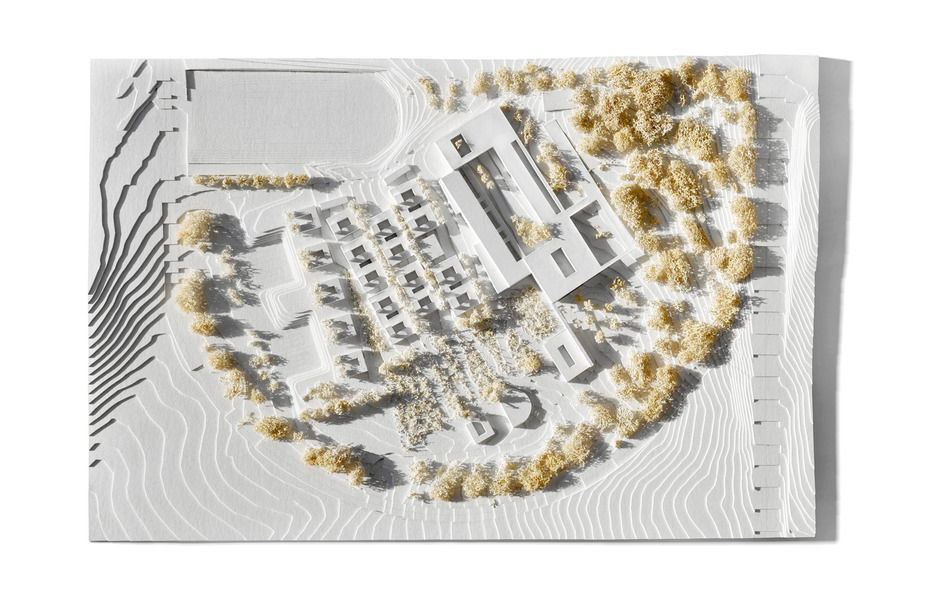 This boarding school offers a diversity of teaching and living spaces in a compact layout. The school is located in an elevated arid plateau, with large temperature differences between day and night and summer and winter. The compactness serves to keep the walking distances short and protected and to increase social interaction among students. This planimetric density is countered by a sectional openness. Benefitting from the slope of the site, the buildings are staggered in section allowing each building to look over the one’s below it towards the valley and mountains beyond.