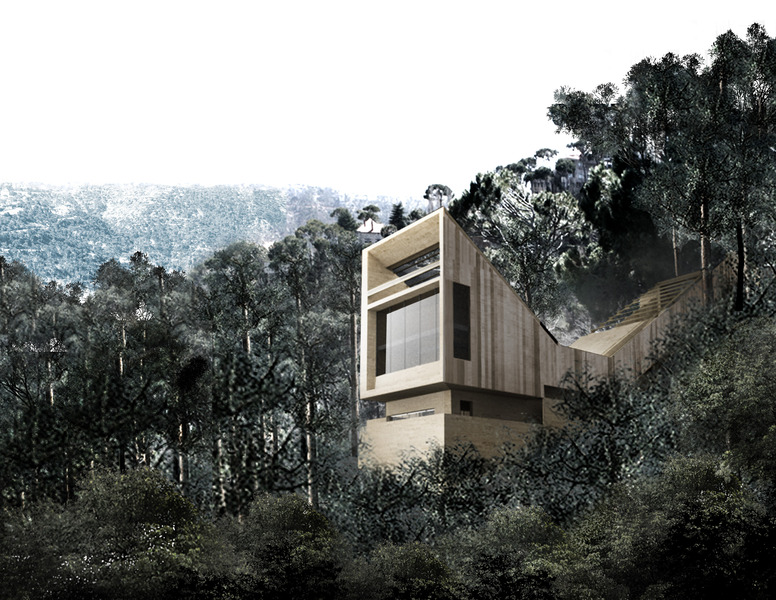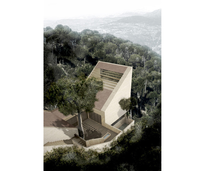 On a very steep and narrow site overlooking Mount Sannine, the house was to be located at about 20 meters below the street. In order to capture the best view and site width. As such, a funicular was introduced to link the arrival level with the living area. The arrival level along the street is a terrace with parking with an independent guest room underneath. The main house area consists of a series of terraces with the central terrace acting as a central courtyard and the adjacent two enclosed to become the house. The terraces between the guest and main house consist of a vegetable garden and an orchard. The site outside the limits of the terraces and the setback lines is left sloping enhancing the geometry of the house and its role as a measuring device for the slope and the view.