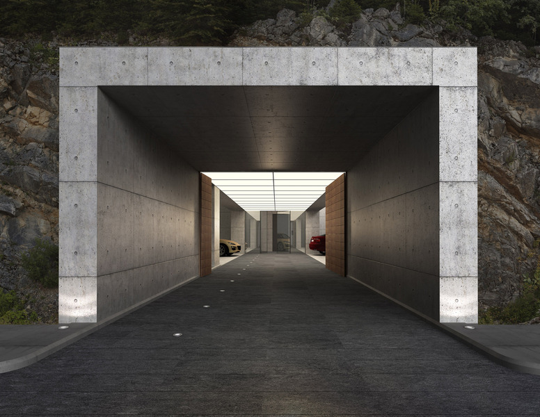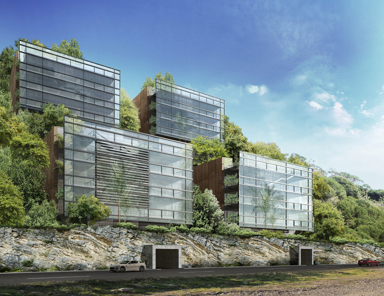 Architecturally, the buildings attempt to blend with the landscape by integrating greenery on the roof and in the space between the outer glass screen in front of the balconies and the inner façade. The side elevations have the color of the earth and the terraces of the units are all integrated into the surrounding landscape. The front glass façade is suspended in front of the building giving it a very light effect. This façade also create a common green area behind it and it provides a unified system for the balcony glazing. The lobbies of the lower buildings are carved into the natural rocks creating a deep grotto effect that leads to a strongly contrasting and well lit glass elevator lobby. The lobbies of the upper buildings are in contrast open to the view.